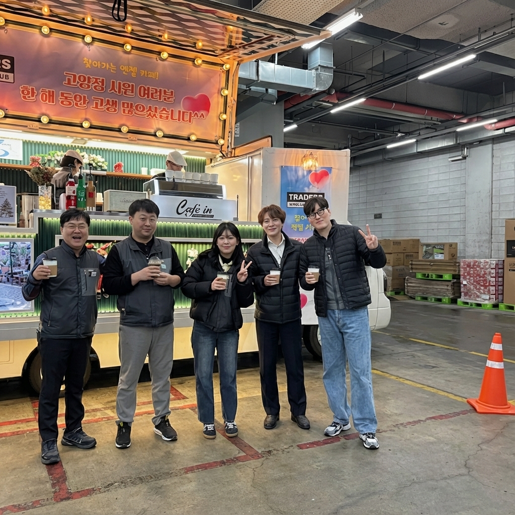 올 한 해도 고객들을 위해 쉼 없이 달려온 우리 이마트 트레이더스 고양점 식구들을 응원하러 찾아온 커피차 덕분에, 따뜻한 커피 한 잔의 여유를 만끽하며 동료들과 활짝 웃고 다시 힘차게 업무에 몰입할 수 있는 최고의 에너지를 선물 받았습니다!